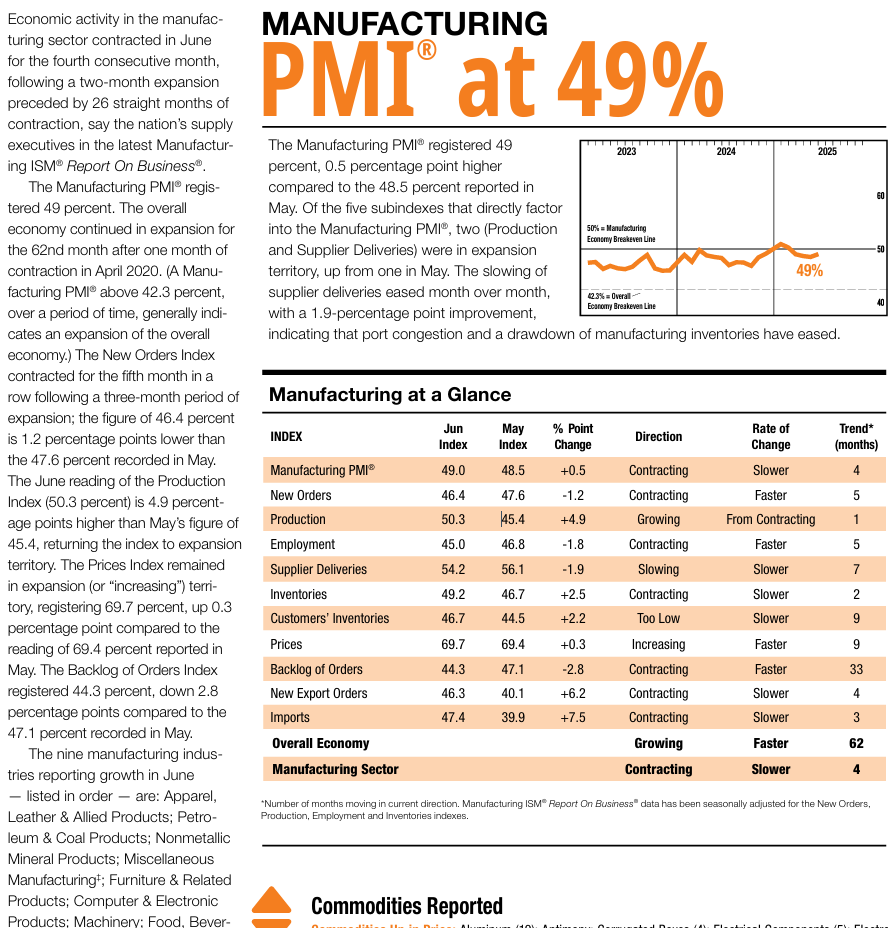 - 신규주문(New Orders): (12월) 52.5 → (25년 1월) 55.1 → (2월) 48.6 → (3월) 45.2 → (4월) 47.2 → (5월) 47.6 → (6월) 46.4
